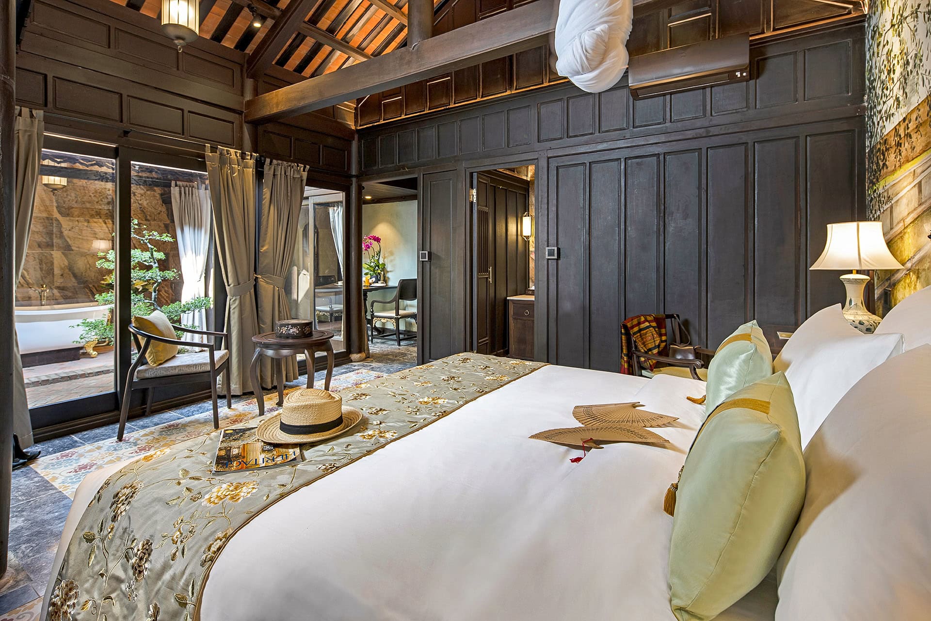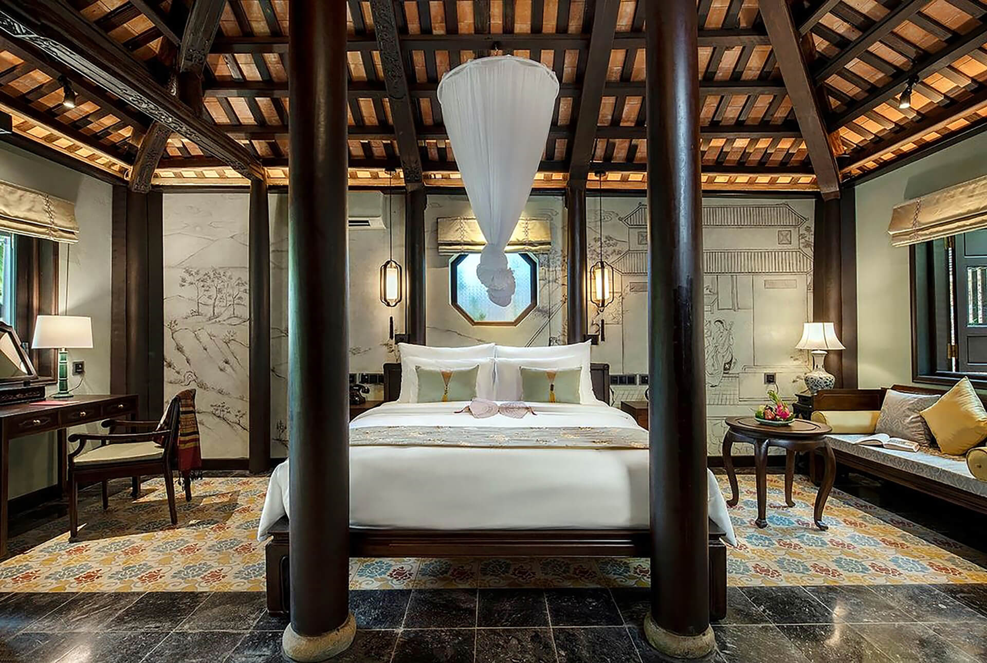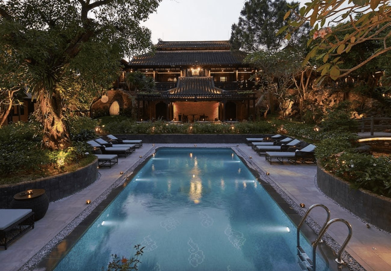 • Khu nghỉ dưỡng bao gồm các ngôi nhà rường cổ được phục dựng nguyên vẹn, nằm giữa khu vườn truyền thống với hồ sen và cây ăn trái. Đây là đỉnh cao của nghỉ dưỡng văn hóa tại Huế.