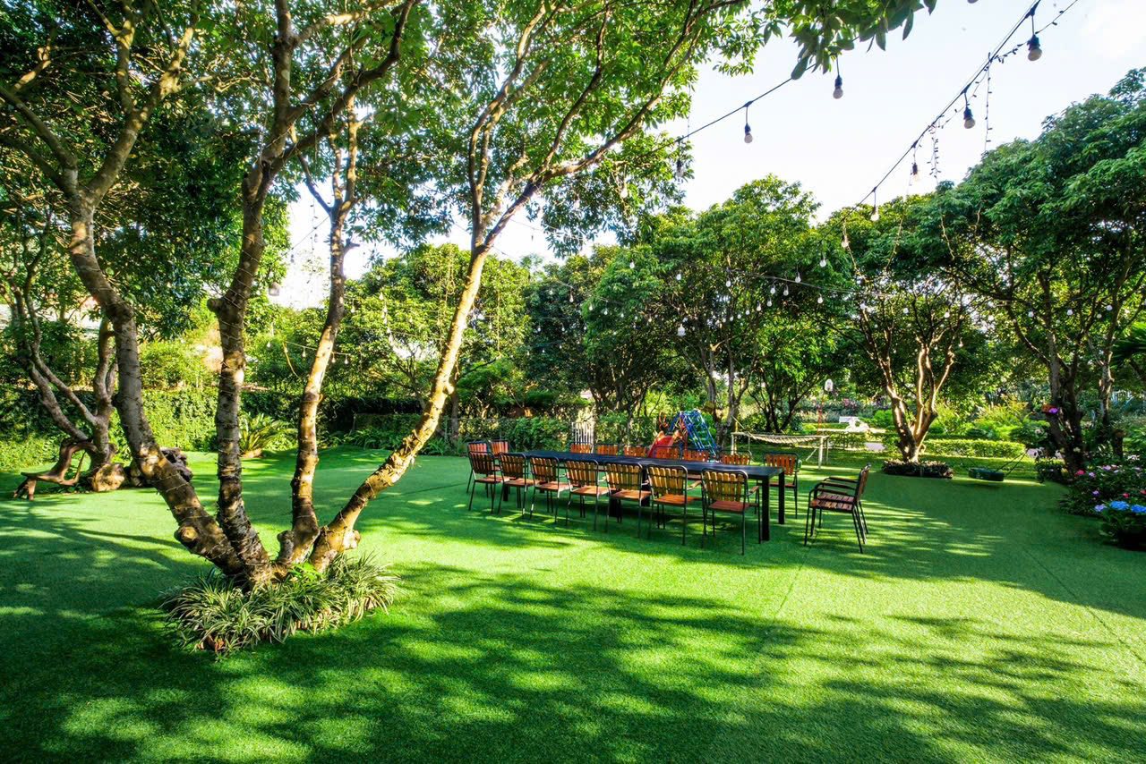 Villa sở hữu diện tích cực lớn với thiết kế hiện đại, nổi bật bởi bãi cỏ xanh mướt thích hợp cho các hoạt động Team Building và tiệc ngoài trời.